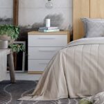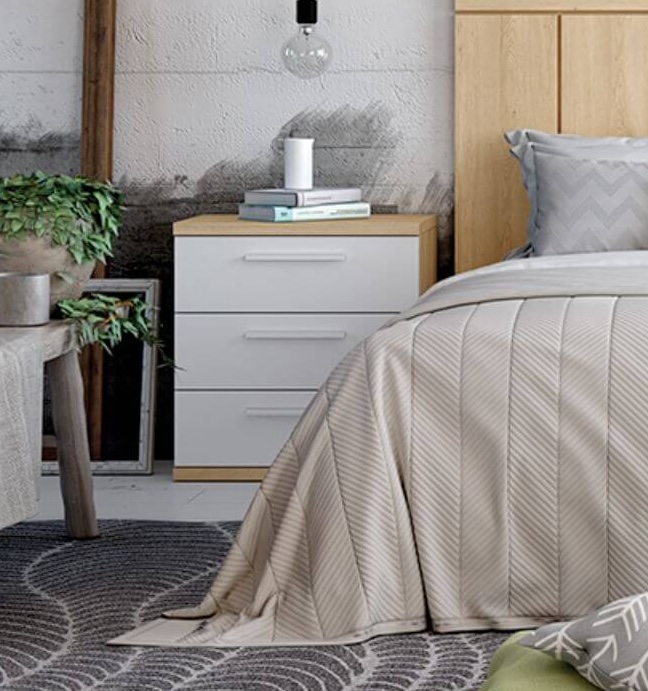 Tauleta de nit amb 3 calaixos Basic de la sèrie Ghio. Fabricada amb tauler de partícules melaminitzat.